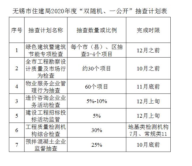 无锡市住建局2020年度“双随机、一公开”抽查计划表
