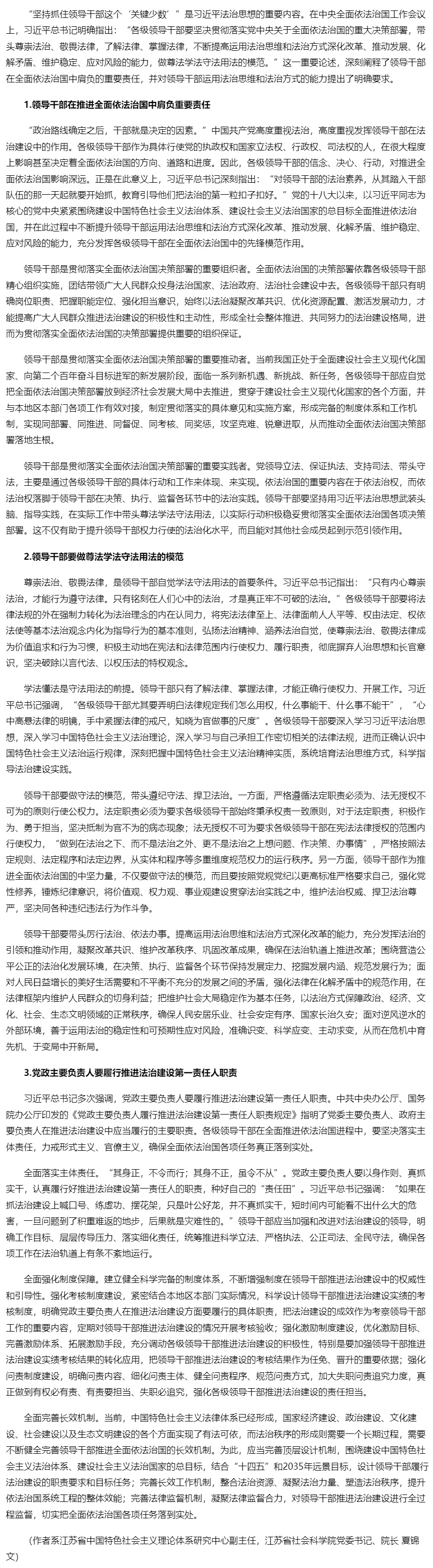 推进全面依法治国要坚持抓住领导干部这个“关键少数”