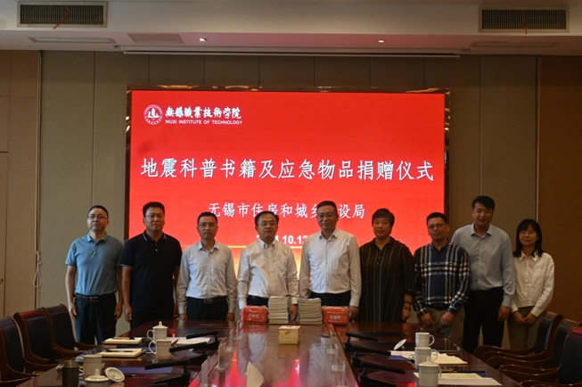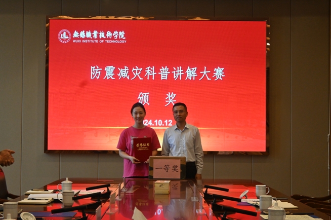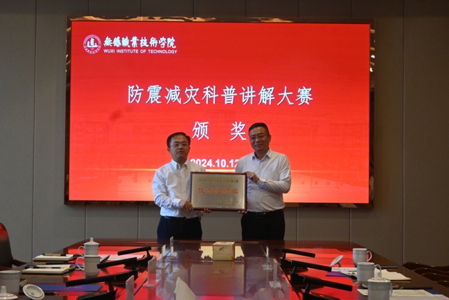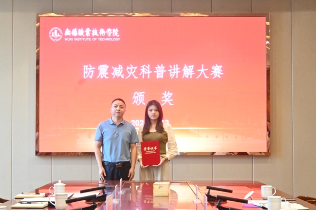 市住房城乡建设局为无锡职业技术学院选派参加省、市防震减灾科普讲解比赛中获奖的选手颁奖,向学院捐赠地震科普书籍、应急物品等,并分发防震减灾宣传资料。