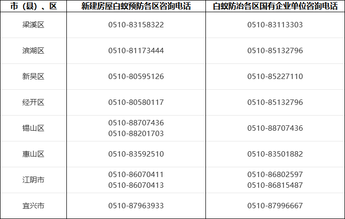 提醒:根据《城市房屋白蚁防治管理规定》(建设部130号令)、《无锡市房屋安全管理条例》等法规要求:无锡地区新建房屋白蚁预防由属地住房建设部门统一组织实施,新建房屋白蚁预防不收费;既有房屋及其它类别的白蚁治理实行市场化运作,委托方可以自主选择白蚁防治单位。